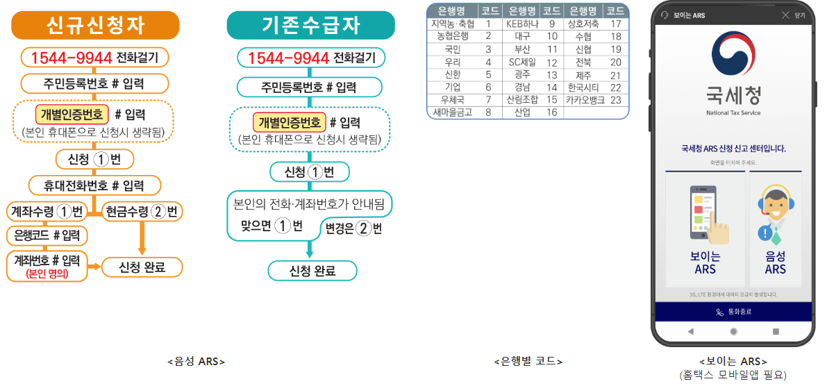 - 신청안내문에 있는 QR 코드 스캔 → 개별인증번호가 채워진 홈택스 모바일 신청화면 → 주민등록번호 뒤 7자리 입력 → 신청