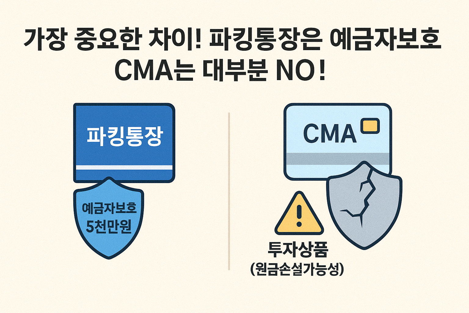 - CMA: 아니요! 이게 가장 큰 차이점이에요! CMA는 예금이 아니라 '투자 상품'이기 때문에, **대부분 예금자보호 대상이 아니에요.** 물론 CMA가 투자하는 RP나 MMF 등은 매우 안전한 곳에 투자하기 때문에 원금 손실 위험이 아주 낮긴 하지만, 이론적으로는 0%가 아니라는 점! 꼭 기억해야 해요. (일부 증권사가 자체적으로 보호해주는 상품도 있지만, 예금자보호와는 달라요!)